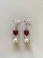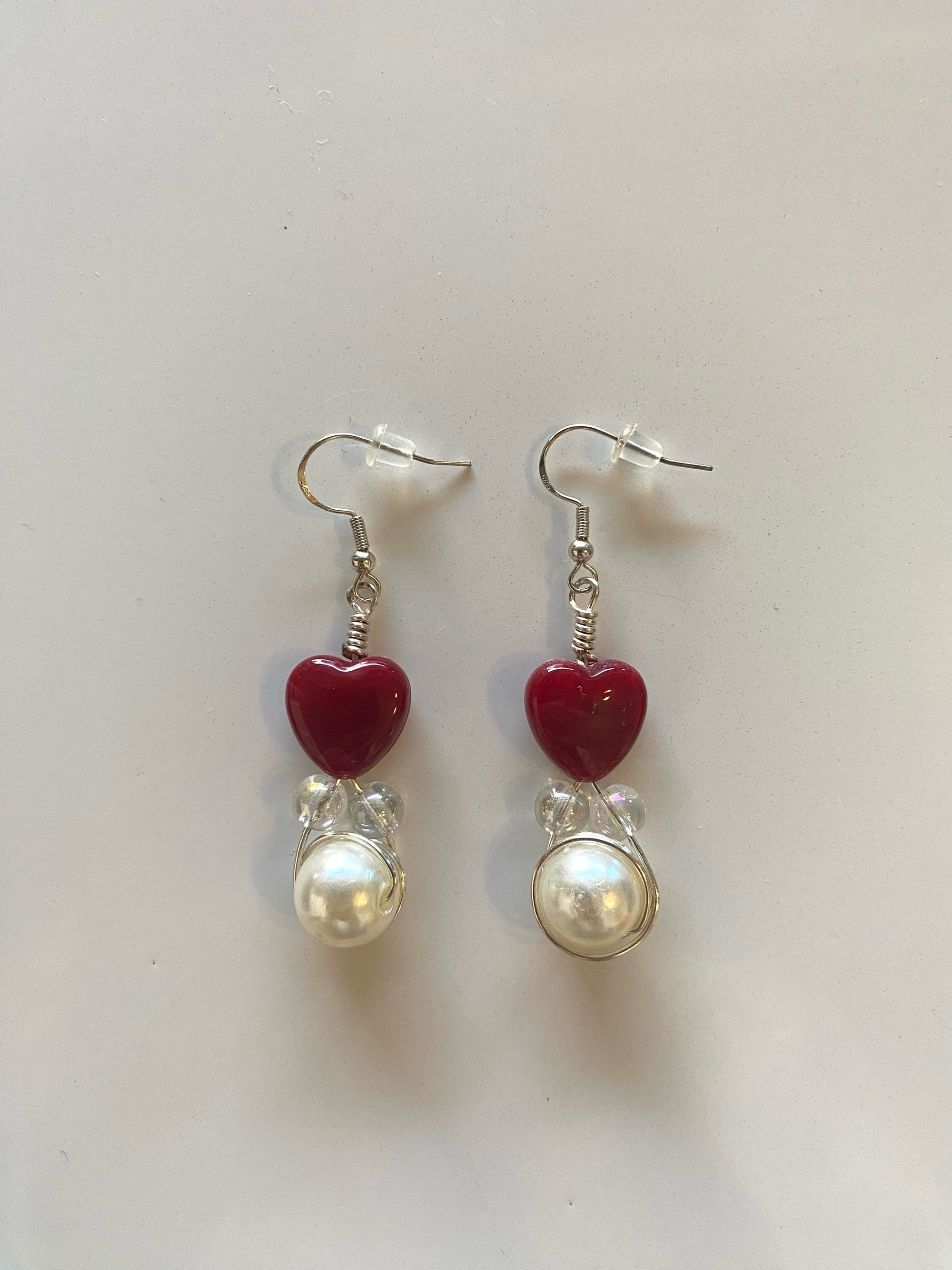 Made with silver wire, red heart charms, small clear beads, and a medium-sized pearl.