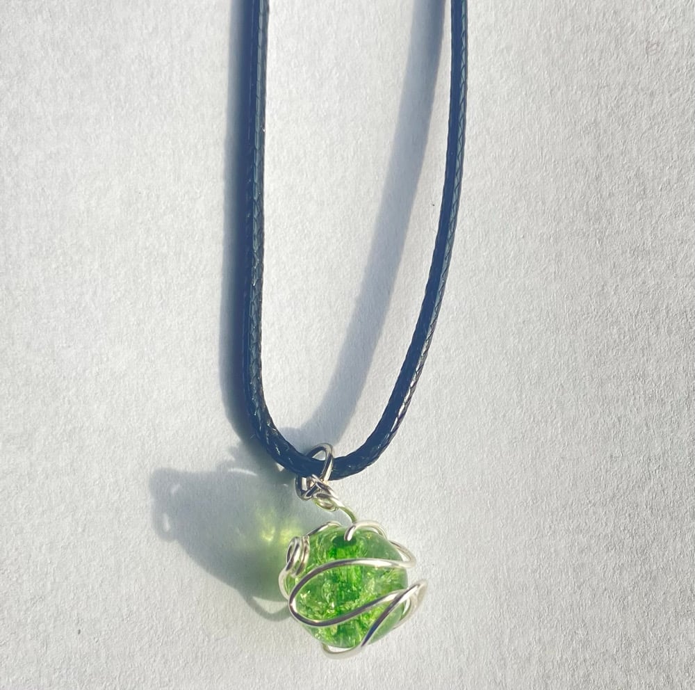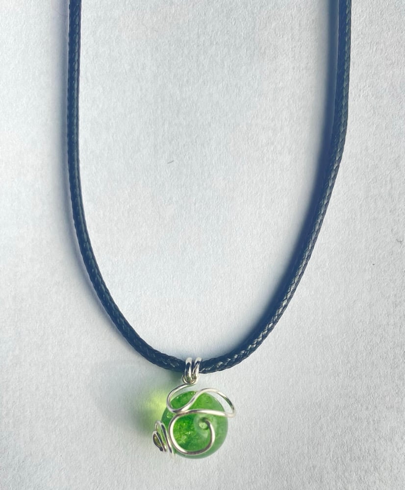 Repurposed green beads surrounded by swirls of silver-gauge wire.